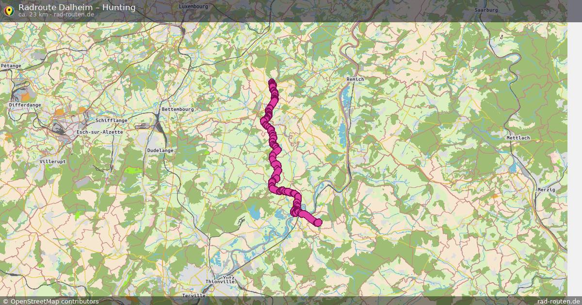 Die Fahrradroute von Dalheim nach Hunting ist ca. 23 km lang und führt über Lëtzebuerg und Thionville. Wichtige Straßen auf der Strecke: Route de Malling und Rue des Romains.