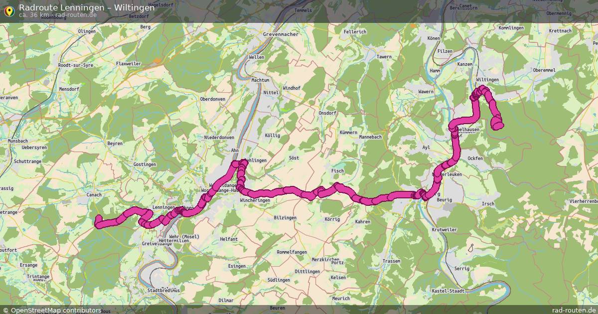 Die Fahrradroute von Lenningen nach Wiltingen ist ca. 36 km lang und führt über Wincheringen, Wellen, Rehlingen und Söst.