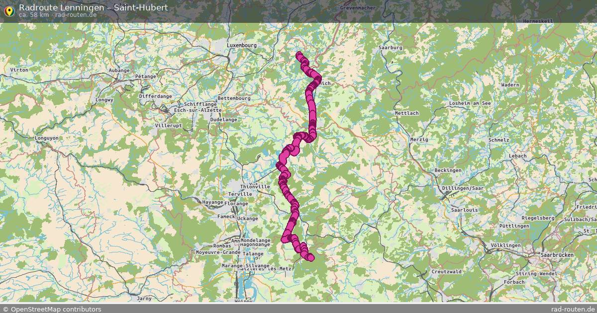 Die Fahrradroute von Lenningen nach Saint-Hubert ist ca. 58 km lang und führt über Condominium Lëtzebuerg-Deutschland, Perl, Thionville und Forbach-Boulay-Moselle. Wichtige Straßen auf der Strecke: PC 3, Chemin de la Moselle und Rue Principale.