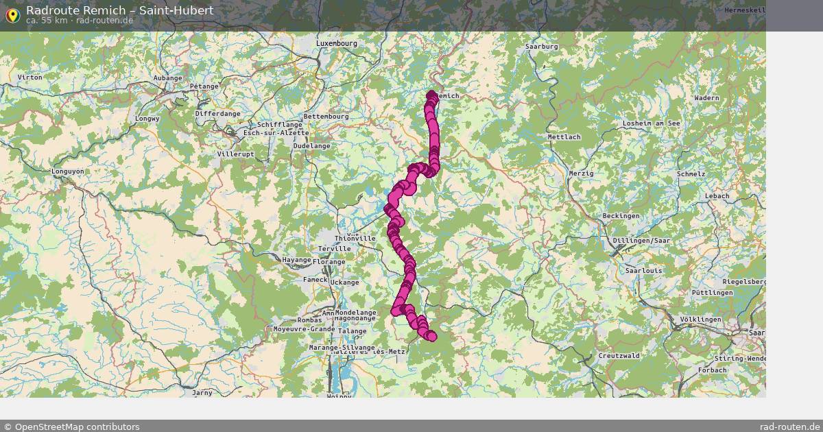 Die Fahrradroute von Remich nach Saint-Hubert ist ca. 55 km lang und führt über Condominium Lëtzebuerg-Deutschland, Perl, Thionville und Forbach-Boulay-Moselle. Wichtige Straße auf der Strecke: Chemin de la Moselle.