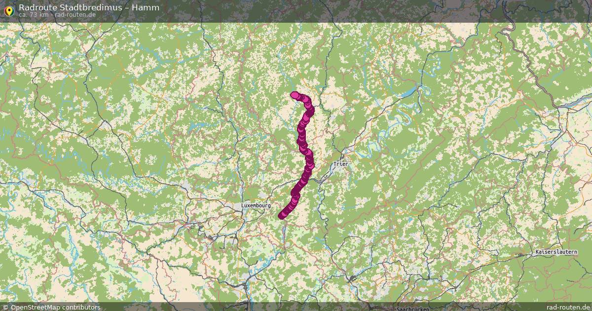 Die Fahrradroute von Stadtbredimus nach Hamm ist ca. 73 km lang und führt über Südeifel, Bitburger Land, Masholder und Bitburg. Wichtige Straße auf der Strecke: Sauerlinn.